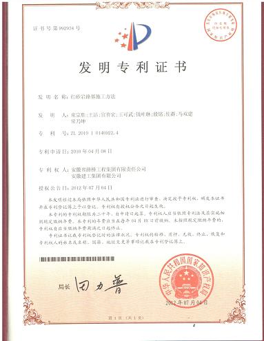 同時,集團公司與路橋集團聯合研發的“紅砂巖路基施工方法”也于當日獲得發明專利授權(專利號:ZL 2010 1 0140922.4)。
