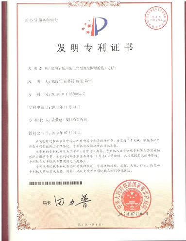 2012年7月4日,由安徽建工集團有限公司自主研發的“陡坡巖質河床上異型深水圍堰的施工方法” 獲得國家知識產權局發明專利授權(專利號:ZL 2010 1 0556962.7)。