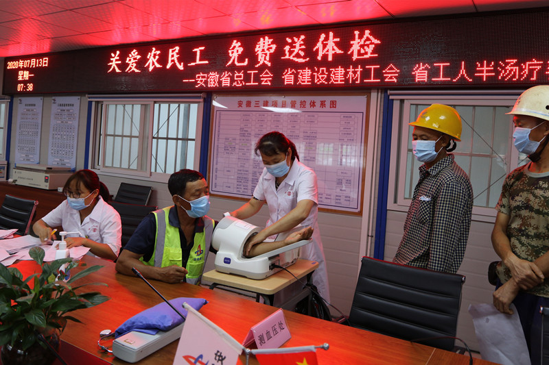 7月13日,由安徽省總工會組織,省建設建材工會、省工人半湯溫泉療養院承辦的“關愛農民工、免費送體檢”活動來到了安徽三建合肥市中心圖書館項目,近120名現場農民工參加了體檢。
