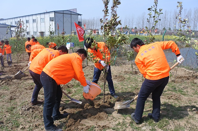 春回大地萬物蘇,植樹添綠正當(dāng)時。為踐行環(huán)保理念,項目部團支部于3月21日組織了植樹活動。大家統(tǒng)一著裝,佩戴志愿者徽章,高揚“建工青年志愿者服務(wù)隊”隊旗,在拌和站及項目部附近的空地上種植了近500棵樹苗?;顒又校驹刚邆兎e極行動,干得熱火朝天,大家三五人一組,揮鍬鏟土,扶苗填坑,踏土夯苗,認(rèn)真完成每一道工序??粗恢曛辍扒嗄曛驹笜洹背晒υ苑N,大家都露出了會心的笑容,項目部也在喜添新綠后變得生機盎然。