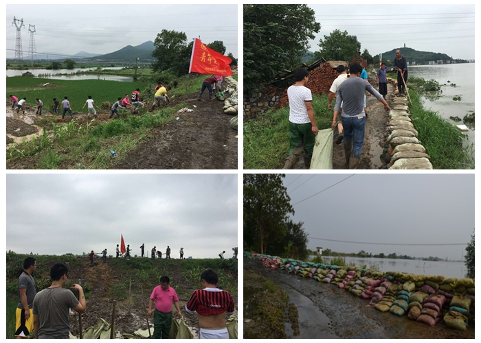 2016年7月1日,巢湖市境內持續降雨,降雨量在每24小時50mm以上,屬于特大暴雨,項目部沿線的橋梁路基施工段落受影響嚴重。項目團支部立即成立了抗洪救險青年突擊隊,向每一名隊員發出了“做建工優秀青年,打贏防汛攻堅戰”的號召。青年突擊隊員們發揚“召之即來,來之能戰,戰之能勝”的精神,快速響應,奔赴抗洪一線。石黃路為當地的出行要道,為保護當地群眾生命財產安全,保障車輛的正常通行,青年突擊隊員持續搶險4個小時,堆碼沙袋300余條,保住了這條要道的通暢。