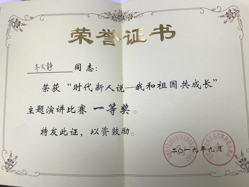 2019包河區蕪湖路街道“我與祖國共成長”演講比賽第一名