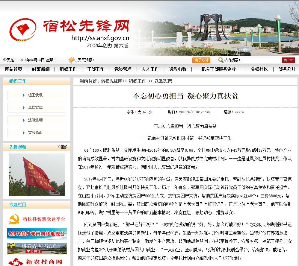 6月1日,《宿松先鋒網(wǎng)》以《不忘初心勇?lián)?dāng) 凝心聚力真扶貧》為題,對(duì)安徽建工集團(tuán)自2017年4月以來,積極響應(yīng)黨和國家號(hào)召,情系貧困群眾、創(chuàng)新扶貧方式的典型做法和顯著成效等進(jìn)行了專題報(bào)道。