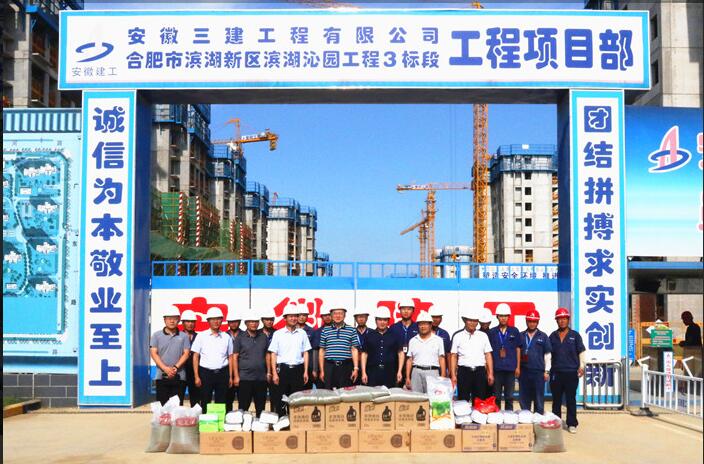 七月中旬以來,持續高溫,正值施工生產旺季,安徽建工集團廣大職工戰高溫、斗酷暑奮戰在生產第一線。集團領導心系一線職工,7月16日至25日,集團公司領導趙時運、劉家靜、牛曙東、楊廣亮、戴良軍、許克順、霍向東、王厚良、宋志華、牛曉峰、申玉恩分赴施工生產一線,看望慰問廣大職工,檢查生產安全情況和防暑降溫工作情況,并為他們送去綠豆、白糖、毛巾、仁丹、十滴水等防暑降溫物品。