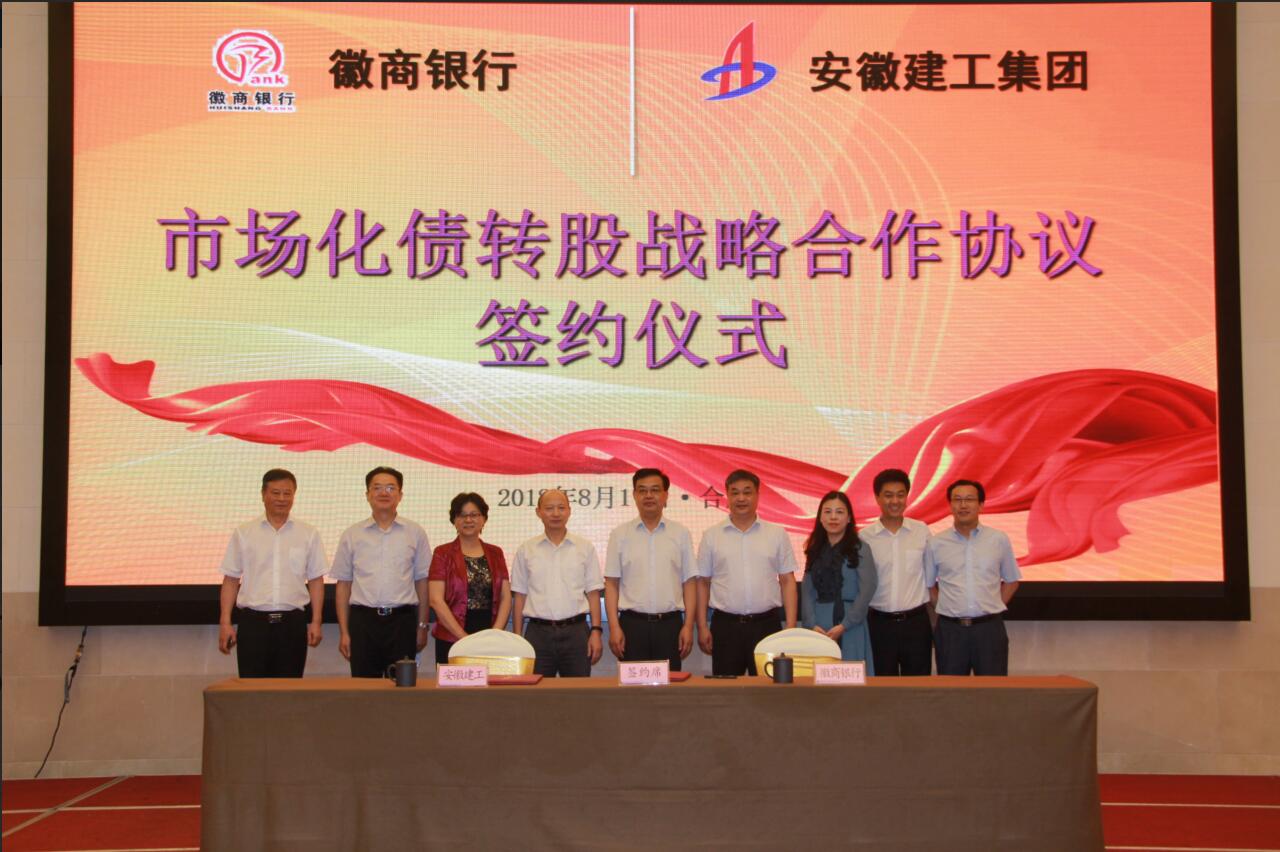 8月17日下午,安徽建工集團與徽商銀行市場化債轉股戰略合作協議簽約儀式于合肥白金漢爵酒店成功舉辦。安徽省國資委黨委副書記(正廳級)、副主任項小龍,副主任、黨委委員陳方到會并見證簽約儀式,徽商銀行黨委書記、董事長吳學民,集團黨委書記、董事長趙時運分別致辭。儀式由集團總經理劉家靜主持。