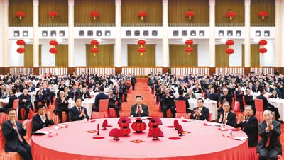 人民大會堂宴會廳燈光璀璨、暖意融融,各界人士約1000人歡聚一堂、共迎新春,歡聲笑語間洋溢著喜慶祥和的節日氣氛。