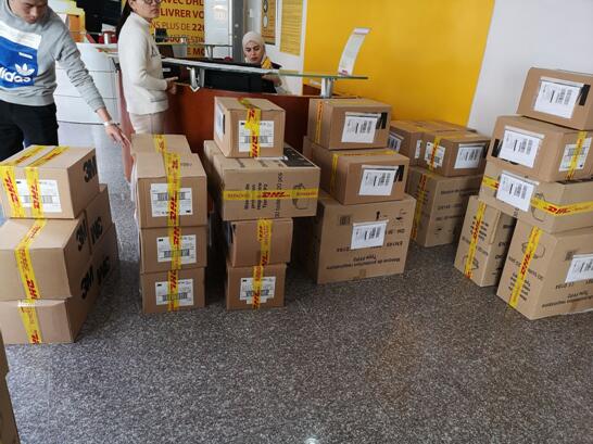 由于采購的防疫物資數量大,而又恰逢周末,貨運公司人手不足。為爭分奪秒,縮短物資發運時間,采購小組主動前往DHL航空貨運公司,協助貨運公司工作人員對防疫物資進行分裝、打包、貼簽。然而難題又出現了,按照貨運公司規定,大宗物資必須分批次進行報關發貨,這樣好不容易采購到的防疫物資就不能全部在第一時間內抵達國內。經過討論和咨詢,并與貨運公司反復協商,駐阿經理部決定以公司名義辦理報關,并迅速整理遞交了報關資料,全力協助DHL貨運公司發運防疫物資,最大限度確保防疫物資盡快運抵國內。