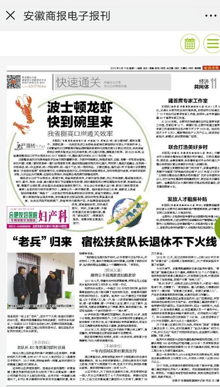 3月8日,宿松縣召開(kāi)縣摘帽第三方評(píng)估座談會(huì),我集團(tuán)派駐趾鳳村第一書(shū)記、扶貧工作隊(duì)長(zhǎng)鄭軍作為5位參會(huì)代表之一,受邀在會(huì)上發(fā)言。他以老同志扶貧為主題的發(fā)言受到了與會(huì)人員的廣泛好評(píng),安徽商報(bào)由此于3月11日專(zhuān)門(mén)刊登了題為《“老兵”歸來(lái),宿松扶貧隊(duì)長(zhǎng)退休不下火線》的報(bào)道文章,引起較大反響。