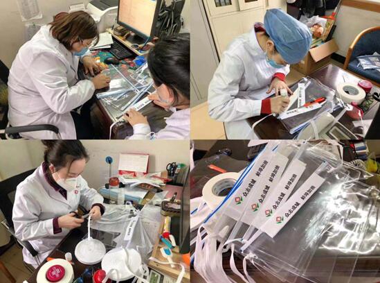 在醫(yī)院部分防護(hù)物資短缺的情況下,為了加強(qiáng)醫(yī)護(hù)人員的自身防護(hù),降低被感染的概率,青年突擊隊(duì)成員們共同努力出謀劃策,利用文件袋、透明塑料薄膜制作成防護(hù)面罩,有效地緩解了防護(hù)用品短缺的難題。