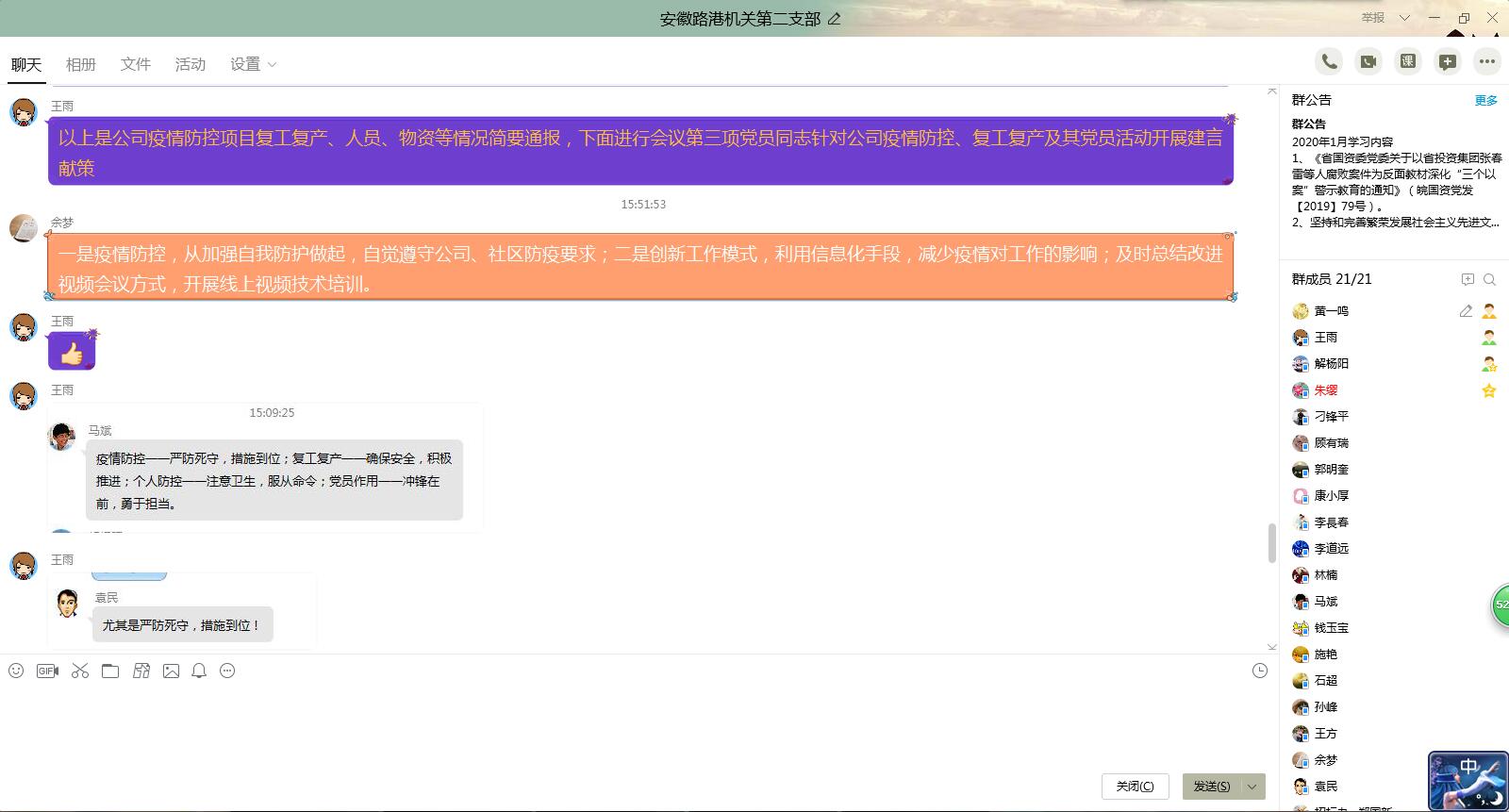 各黨支部以現場學習和視頻會議等方式,學習習近平在統籌推進新冠肺炎疫情防控和經濟社會發展工作部署會議上的講話精神、集團防疫復工復產會議精神、公司《關于加快疫情防控期間項目復工工作的通知》、《復工后新型冠狀病毒感染肺炎疫情防控知識手冊》等內容。