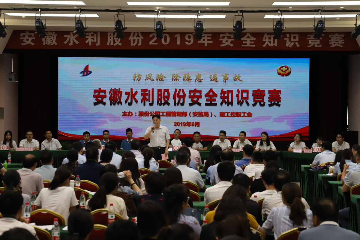 6月12日下午,由控股工會、股份公司工管部(安監局)聯合舉辦的安徽水利股份安全知識競賽在安建國際大廈三樓報告廳如期舉行。建工控股黨委委員、股份公司總經理許克順出席活動并致開幕詞,股份公司副總經理孫學軍、安徽省建設建材工會主任程德旺、副主任葉雪清受邀出席活動。