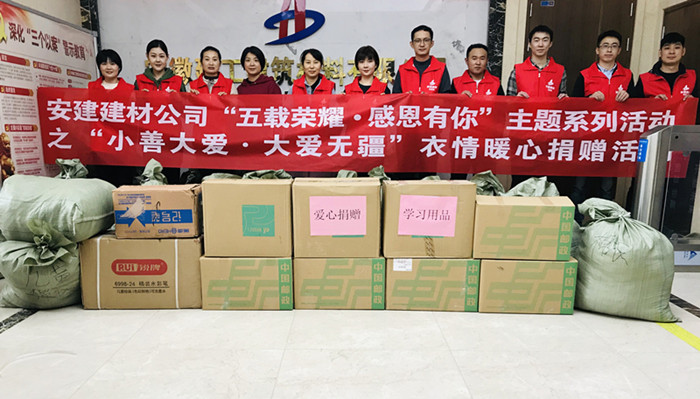 為彰顯企業(yè)社會(huì)責(zé)任感,傳遞社會(huì)正能量,近期安建建材開展了“五載榮耀•感恩有你”主題系列活動(dòng)之第四屆“小善大愛·大愛無(wú)疆”衣情暖心捐贈(zèng)活動(dòng)。