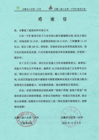 日前,公司收到安徽省六安第一中學感謝信,信件表達了對安建建材“想客戶所想,急客戶所急”高質量供應服務的充分認可,充分肯定了公司的資源整合及保供能力。