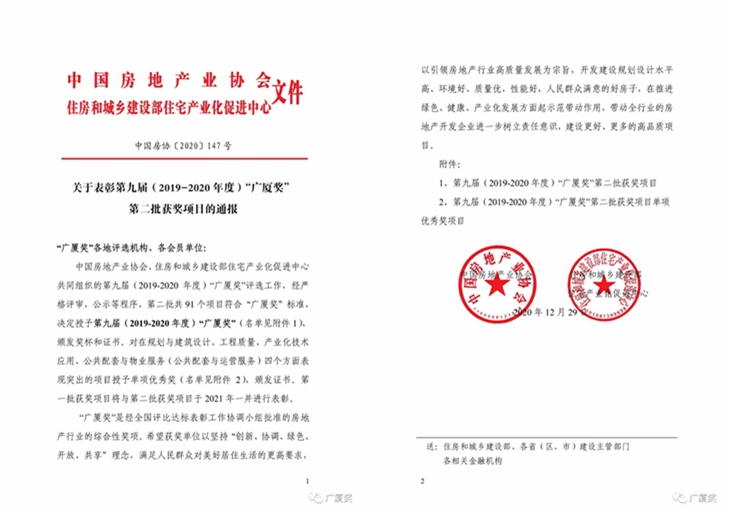 “廣廈獎”是經住房和城鄉建設部批準,由中國房地產業協會、住房和城鄉建設部住宅產業化促進中心共同設立的我國房地產開發項目的綜合性大獎。是由住宅與城鄉建設部頒發,經國務院批準設立的國家級房地產獎、行業內最權威的房地產獎項評選,相當于魯班獎、梁思成獎、詹天佑獎,代表房地產綜合開發行業的最高榮譽。