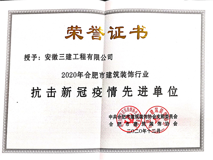 近日,經合肥市建筑裝飾協會評選,安徽三建公司被授予2020年度“合肥市建筑裝飾優秀企業”和“合肥市建筑裝飾行業抗擊新冠疫情先進單位”稱號。安徽三建公司已經連續多年獲“合肥市建筑裝飾優秀企業”榮譽。由于在抗擊疫情中的突出貢獻,此前公司已獲得“安徽省抗擊新冠疫情先進集體”“全國住房和城鄉建設系統抗擊新冠肺炎疫情先進集體”稱號。