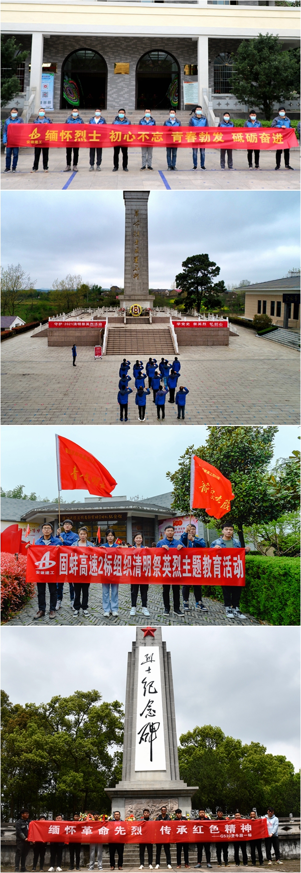蒙城PPP項目黨支部組織黨員和職工來到蒙城縣革命烈士陵園掃墓祭奠,向革命烈士敬獻花籃,表達哀思;淮北片區(qū)黨支部組織黨員、團員青年和職工瞻仰泗縣烈士陵園,銘記歷史,致敬革命先烈;合肥軌道交通3號線南延2標項目黨支部前往新四軍江北指揮部開展黨史教育,重溫入黨誓詞,牢記初心使命;引江濟淮聯(lián)合黨支部追尋紅色足跡,在茶壺山烈士陵園紀念碑前,唱響國歌,靜思默哀;暢通二環(huán)(西南環(huán))項目黨支部組織開展“網(wǎng)上祭英烈”活動,廣大黨員、團員青年和職工登陸網(wǎng)上紀念館,緬懷革命先烈,表達對英雄的敬意。