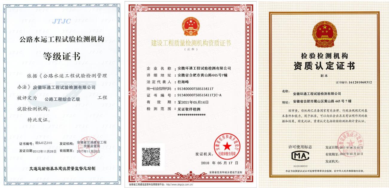 2004年至今,環(huán)通公司累計(jì)參與試驗(yàn)檢測和服務(wù)的項(xiàng)目數(shù)百個,先后參與了安徽省“四縱八橫”所有高速公路和大廣、濟(jì)祁、仁新、延吳、昌寧、蕪湖長江二橋、黃河特大橋等一大批國家高速公路工程的試驗(yàn)檢測,足跡遍布全國各地。參與試驗(yàn)檢測和服務(wù)的項(xiàng)目先后榮獲國際橋梁大會(IBC)最高獎—“喬治·理查德森獎”、 中國建設(shè)工程“魯班獎”、“國家優(yōu)質(zhì)工程獎”、中國土木工程“詹天佑獎”、公路交通優(yōu)質(zhì)工程“李春獎”、“全國市政金杯示范工程獎”等眾多國際和國家級大獎。2017年,成功進(jìn)入合肥市軌道交通市場,承擔(dān)四號線土建施工和原材料試驗(yàn)檢測,在軌道交通試驗(yàn)檢測領(lǐng)域取得了突破,彌補(bǔ)了安徽路橋在軌道交通領(lǐng)域試驗(yàn)檢測的空白。