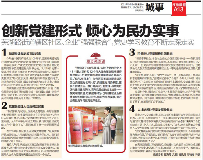 2021年5月24日,《江淮晨報(bào)》以“創(chuàng)新黨建形式、傾心為民辦實(shí)事”為題,專題報(bào)道安建建材黨史學(xué)習(xí)教育開(kāi)展情況。《江淮晨報(bào)》指出,在蕪湖路街道,以城南社區(qū)、安建建材為代表的的社區(qū)和企業(yè)紛紛創(chuàng)新學(xué)習(xí)形式,著力聚焦“學(xué)黨史、悟思想、辦實(shí)事、開(kāi)新局”,不斷推進(jìn)黨史學(xué)習(xí)教育走深走實(shí)。同時(shí)也在學(xué)習(xí)強(qiáng)國(guó)合肥市學(xué)習(xí)平臺(tái)進(jìn)行報(bào)道。