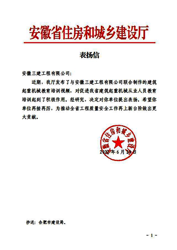 6月24日,安徽省住房和城鄉建設廳給安徽三建公司發來表揚信,感謝該公司聯合省住建廳制作建筑起重機械教育培訓視頻,對促進我省建筑起重機械從業人員教育培訓起到了積極作用。