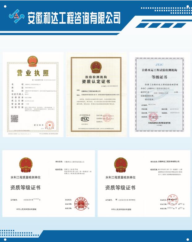 和達咨詢的前身是安徽水利中心實驗室,2012年因交通項目市場經營及質量監管需要,注冊成立安徽江河試驗檢測有限公司,2018年更名為安徽和達工程咨詢有限公司。經過多年發展,現擁有“交通部公路工程試驗檢測綜合乙級”“水利部水利混凝土專項甲級”及“巖土專項乙級”檢測資質,取得安徽省質量技術監督局計量認證(CMA)證書,具有“建設廳建設工程造價咨詢乙級”資質。檢測用房面積1800平方米,設有收樣室、留樣室、人防檢測室、人防檢測平臺等20余個專業功能室和400余臺套檢測設備,基本滿足日常試驗檢測需要。實現營業收入、利潤、上繳資金逐年大幅增長,2019年代表蚌埠市成功申報建設國家級檢驗檢測集聚區(安徽),被蚌埠市列為重點發展檢測機構。