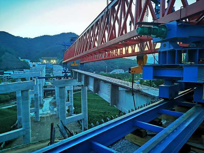 伊河大橋為左右分離式大橋,跨地方水泥路、國道311和伊河,沿線有不少村莊住戶,對施工安全環保方面有更高要求。為此項目部專門增設灑水車、霧炮以及噴淋系統,并用硬質擋板與居民生活區分開。伴隨著機械的轟鳴聲,牽引車將T梁緩緩運至施工點位,經過施工人員半個小時的努力,提梁、位移、落梁等工序一氣呵成,T梁一次安裝就位,在場人員共同見證了這激動人心的時刻。