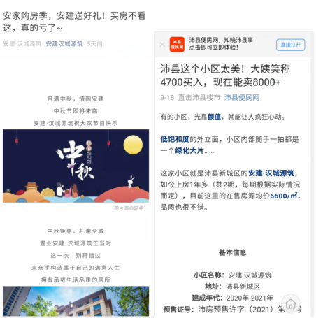 因沛縣防疫要求,安建·漢城源筑項目在中秋節到來之際,以線上推廣促銷活動為主,舉行了“安家購房季——購好房 送豪禮”活動。邀請抖音網紅前來現場拍攝視頻并在抖音發布,宣傳活動信息,并通過便民網、微信公眾號、朋友圈等推廣活動及在售信息。營銷策劃部工作人員節日期間采用輪流排班,堅守營銷崗位,緊抓雙節期間置業節點,緊鑼密鼓加速項目銷售工作。安建漢城源筑9月累計認購住宅19套,車位22個,累計認購金額超2000萬元。