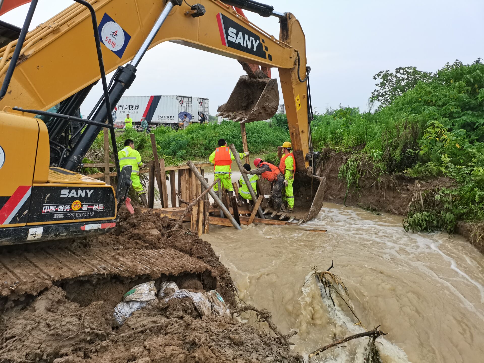 7月19日,安徽路港市政分公司興業大道項目部收到當地政府求助,迅速組建聯合防汛青年突擊隊,并帶領物資設備火速趕到現場配合當地政府封堵小蜀山支渠決堤口。