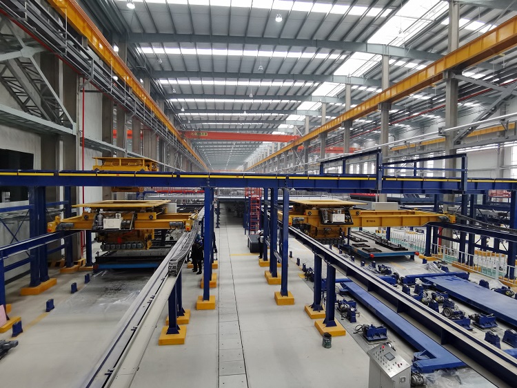 北城工業公司從整體到布局完成了生產工藝大改革。將傳統單一生產線采改為綜合構件生產流水線,保證一線多類構件同時生產,實現了異形構件同點混凝土澆筑工藝;混凝土飛船從單線轉為雙線運輸,實現多線混凝土同時澆筑;養護窯更改為高倉位下沉式養護窯,充分利用地下空間,提高倉位空間使用率,單線實現同時養護57座模臺,并可實現異型構件進窯護養護;考慮到廠區占地面積減少,為提高空間利用率,設計采用了大面積連通式鋼平臺,并配有帶軌道運輸車,大大提高了材料存放、運輸效率;桁架筋自動生產設備、網片自動焊接生產設備、管片鋼筋自動切割分揀彎弧設備,實現了鋼筋智能化加工。混凝土攪拌機從立軸攪拌改為雙臥軸攪拌,實現混凝土強制拌合;蒸汽養護從市政公用改為自有式多聯機組蒸汽發生器,靈活使用,節約成本;貨場桁吊由單梁改為雙梁懸臂吊,擴大吊運范圍,實現構件無障礙倒運。攪拌站擁有全封閉的上料系統,有9個骨料倉和2個輸送線組成,大噸位多組料倉可大量儲存原材料,全封閉自動上料系統,無粉塵,實現綠色環保。