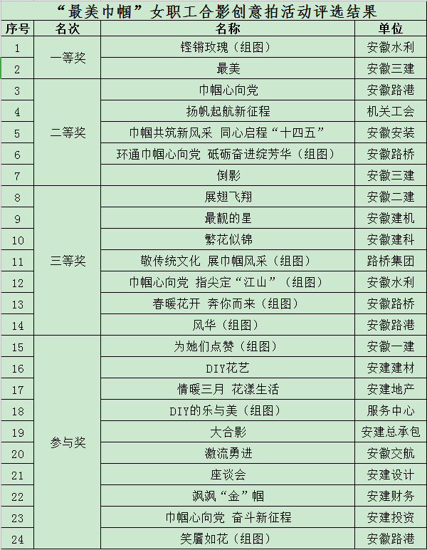 “巾幗心向黨·奮斗新征程”婦女節(jié)主題慶祝系列活動(dòng),“最美巾幗”女職工合影創(chuàng)意拍評(píng)選結(jié)果揭曉。本次活動(dòng)以致敬建黨100周年、巾幗展風(fēng)采為主題,以團(tuán)隊(duì)創(chuàng)意拍的形式,集中展現(xiàn)建工女職工愛黨愛國愛企的熱情,營造了生動(dòng)活潑、妙趣橫生的文化氛圍。活動(dòng)得到了各級(jí)工會(huì)積極響應(yīng),受到女職工們的歡迎,共有來自所屬單位和集團(tuán)機(jī)關(guān)的84幅作品參賽,經(jīng)綜合評(píng)選,最終評(píng)出一等獎(jiǎng)2名,二等獎(jiǎng)5名,三等獎(jiǎng)7名,評(píng)選結(jié)果如下: