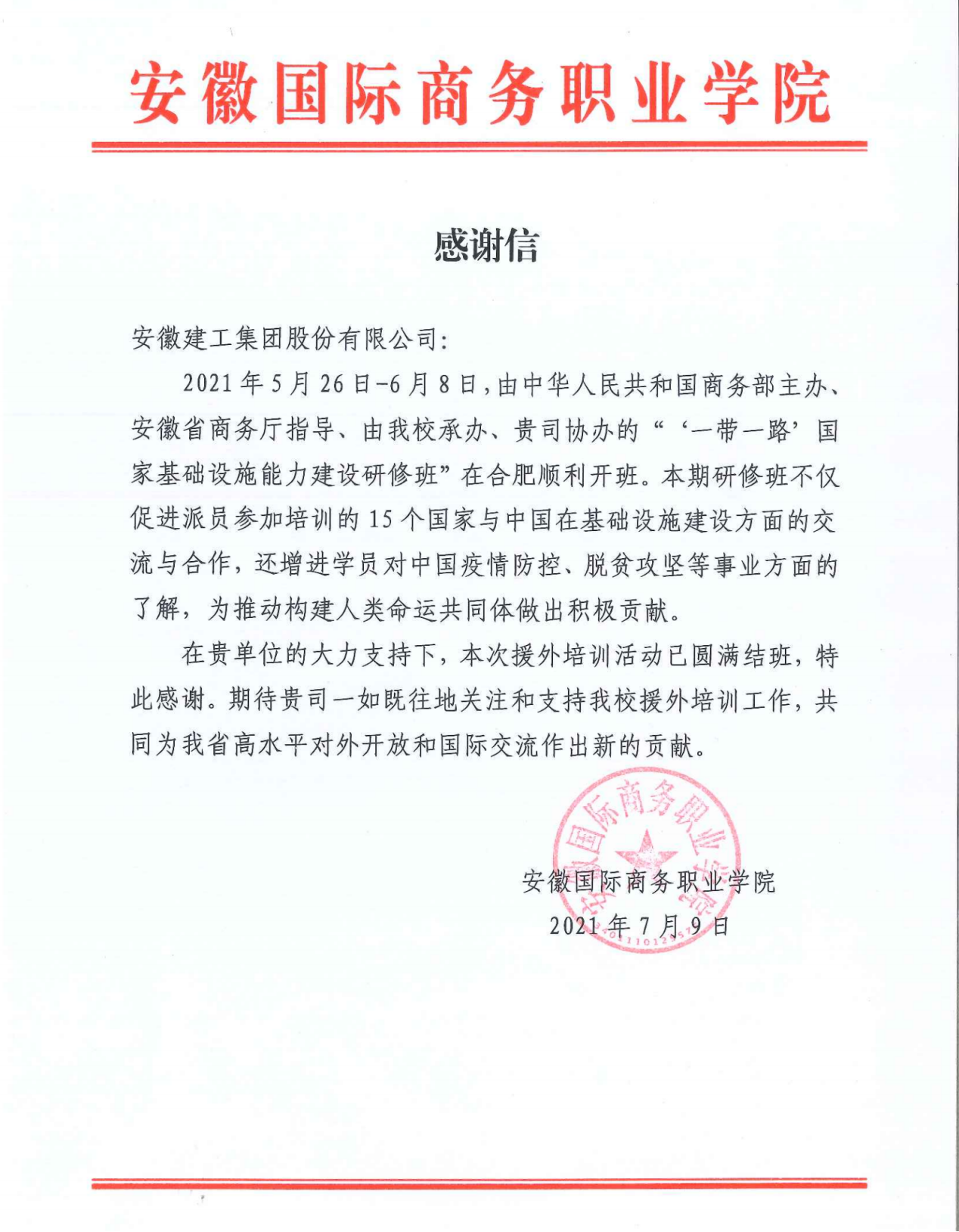 7月9日,安徽集團股份有限公司海外事業(yè)部收到安徽國際商務(wù)職業(yè)學(xué)院來信,對集團在2021年度“一帶一路”國家基礎(chǔ)設(shè)施能力建設(shè)研修班舉辦過程中給予的大力支持表示感謝。