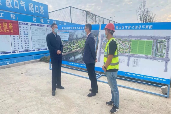 10月21日下午,建工控股黨委委員、副總經理盛明宏赴安徽一建公司機關、蜀山區體育公園項目調研疫情防控與安全生產工作,安徽一建黨委書記、董事長陸勤斌參加調研。