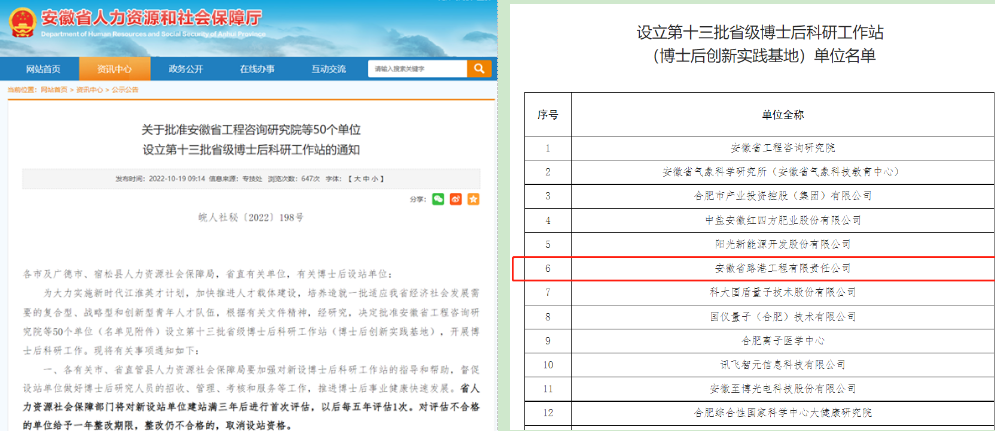 近日,安徽省人力和資源保障廳發布了《第十三批省級博士后科研工作站(博士后創新實踐基地)名單》(皖人社秘〔2022〕198號),集團所屬安徽省路港工程有限責任公司成功獲批省級博士后科研工作站,自此集團公司博士后工作站規模達3個,標志著集團公司在高水平科學研究、高層次人才培養方面又取得了重大突破。