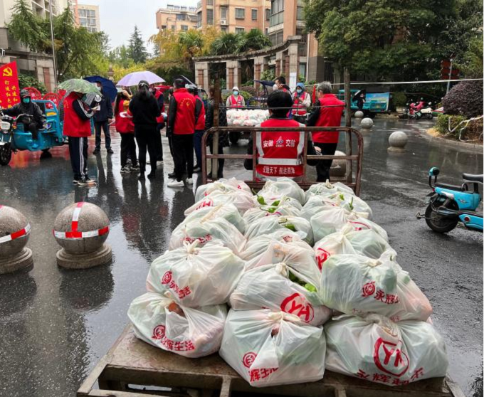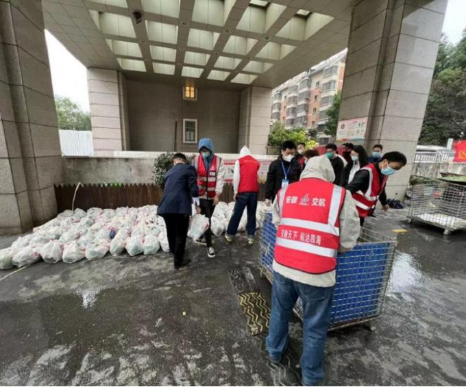 10月26日下午15時,項(xiàng)目部接到嘉山路街道工作人員電話,轄區(qū)內(nèi)美晨雅閣小區(qū)急需人員、車輛協(xié)助發(fā)放居民生活物資。項(xiàng)目部第一時間組織青年志愿者前往該小區(qū)提供志愿服務(wù),志愿者們與社區(qū)工作人員密切配合,一邊緊張有序地裝卸物資,逐個樓棟進(jìn)行發(fā)放,一邊耐心地安撫居民情緒,維持現(xiàn)場秩序,直至晚上21時,順利完成小區(qū)一千多戶居民生活物資的發(fā)放,切實(shí)保障了群眾的正常生活。