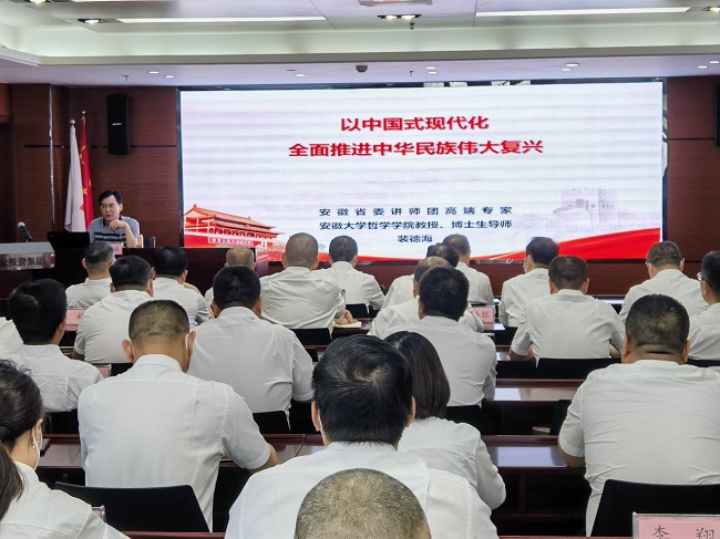 培訓(xùn)邀請到安徽省委宣講團(tuán)高端專家,安徽大學(xué)哲學(xué)學(xué)院教授、博士生導(dǎo)師裴德海進(jìn)行授課。裴教授通過《以中國式現(xiàn)代化全面推進(jìn)中華民族偉大復(fù)興》這一主題,系統(tǒng)闡釋了什么是“中國式現(xiàn)代化”、“中國式現(xiàn)代化”的本質(zhì)要求、“中國式現(xiàn)代化”理論背景和依據(jù)、“中國式現(xiàn)代化”總體戰(zhàn)略安排、實現(xiàn)“中國式現(xiàn)代化”必須牢牢把握的準(zhǔn)則等內(nèi)容,梳理了中國式現(xiàn)代化的發(fā)展脈絡(luò),幫助大家理解和學(xué)習(xí)了中國式現(xiàn)代化的深刻內(nèi)涵及重大意義。廣大學(xué)員紛紛表示,作為黨員領(lǐng)導(dǎo)干部,要在黨的領(lǐng)導(dǎo)下,始終保持“闖”的精神、“創(chuàng)”的勁頭、“干”的作風(fēng),堅定信念,踏實工作,自覺肩負(fù)起建設(shè)中國特色社會主義現(xiàn)代化強(qiáng)國的歷史使命,為開創(chuàng)公司高質(zhì)量發(fā)展新局面凝聚磅礴力量。