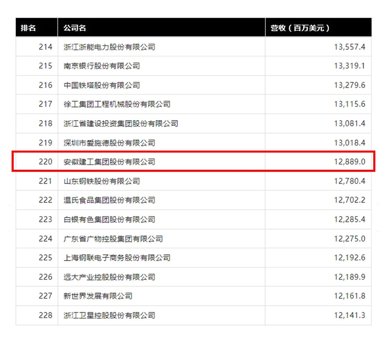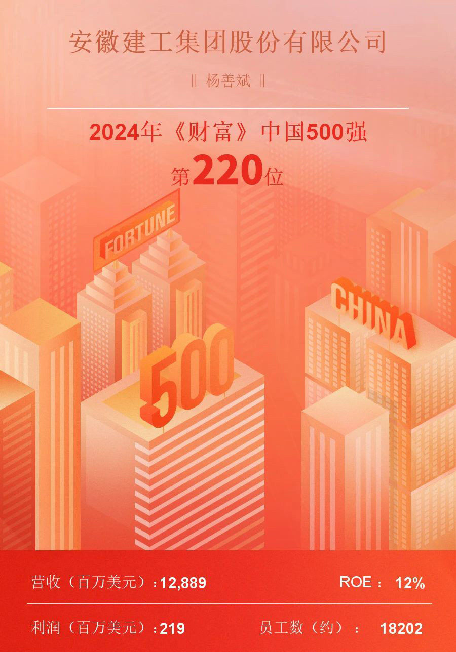 財富Plus APP于北京時間7月25日發布了2024年《財富》中國500強排行榜。安徽建工集團股份有限公司以12,889.0百萬美元的營收名列第220位。