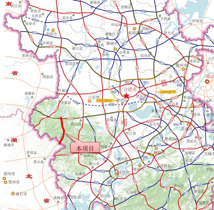 該項目呈南北走向,總體位于六安市金寨縣及霍山縣境內(nèi)。路線全長約45.726公里,為山嶺重丘區(qū)、全封閉、雙向四車道高速公路,設(shè)計速度100公里/小時,路基寬度26米。項目估算總投資約72.89億元,建設(shè)期3年、運營期(含收費期)暫定30年。