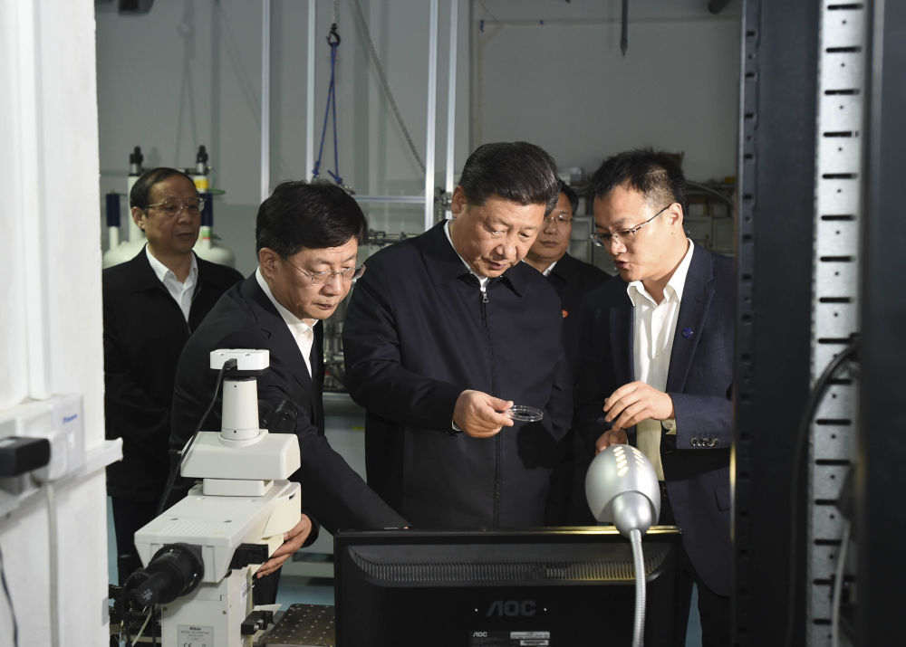 ??2016年4月26日,習(xí)近平在中國(guó)科技大學(xué)近代物理系自旋磁共振實(shí)驗(yàn)室了解科研情況。