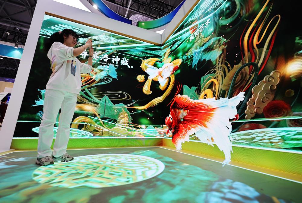 ??2024年4月1日,在安徽合肥舉辦的2024國(guó)際顯示技術(shù)大會(huì)上,一名觀眾體驗(yàn)京東方展出的裸眼3D快速拆裝折角屏。