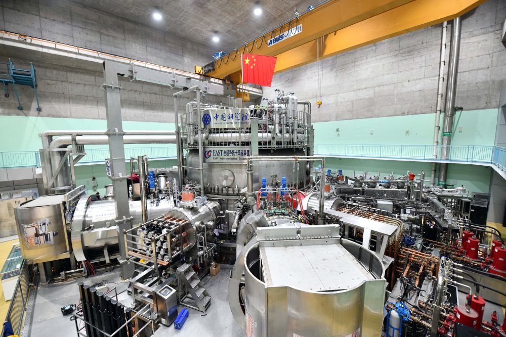 ??這是在安徽合肥科學(xué)島拍攝的“人造太陽(yáng)”——全超導(dǎo)托卡馬克核聚變實(shí)驗(yàn)裝置(EAST)(2021年4月13日攝)。
