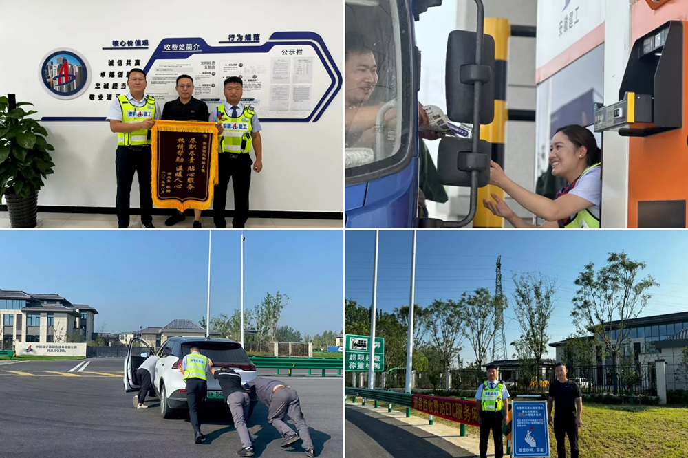 在蕭縣西收費(fèi)站,一名收費(fèi)員于暴雨中主動化身“修車工”,協(xié)助故障車輛脫困,車主事后專程送來錦旗致謝;濉溪北收費(fèi)站工作人員在38℃高溫下,合力將一輛虧電新能源車推行300米至充電樁,及時化解困境。車主感動地表示:“比空調(diào)更涼快的是你們的熱心!”
