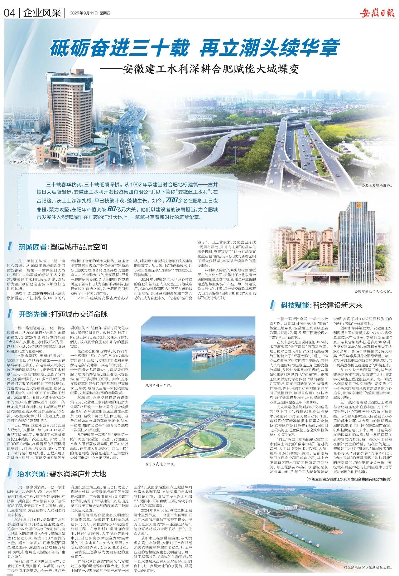 三十載風(fēng)雨兼程,安徽建工水利與合肥這座城市血脈相連;萬千個(gè)日夜堅(jiān)守,匠心精神與時(shí)代發(fā)展同頻共振。從148米的城市天際線到300公里的都市外環(huán),從大別山的清泉到巢湖的碧波,他們用匠心鑄造城市脊梁,以科技賦能建設(shè)未來。每一棟建筑都在訴說奮斗的故事,每一條道路都在延伸發(fā)展的夢想,每一處水利工程都在潤澤民生的希望。站在新的起點(diǎn),安徽建工水利將繼續(xù)以“筑城匠者”的匠心傳承、“開路先鋒”的使命擔(dān)當(dāng)、“治水興城”的智慧韜略、“科技賦能”的創(chuàng)新銳氣,在合肥建設(shè)長三角世界級城市群副中心的壯闊征程中,譜寫更加輝煌的時(shí)代華章。