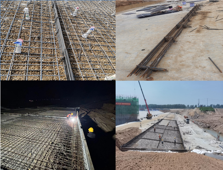 因葉集史河地質為沙地,傳統的降水無法降水,項目創新性地采用消力池降水方案,不僅顯著擴大了降水面積,還成功開啟閘室底板工作面,在降低成本支出的同時大幅縮短了施工周期。在海漫施工中,項目研制新型模板一體化體系,代替原本的7.5m分縫跳倉澆筑方案和傳統模板安裝,做到連續澆筑,由原來的每天澆筑6-8塊提高至每天可澆筑16-32塊。防沖墻的導墻由鋼筋砼優化為裝配式“L”型間距可調節鋼導墻,相比鋼筋砼導墻,鋼結構導墻具有安拆方面、節約成本、不易磕碰、工期短等優點,去除了立模、混凝土澆筑等工序。空箱澆筑分兩層施工,第一層完成后空箱采用機械回填后在澆筑隔板代替預留孔洞人工配合回填,速度更快更安全;格賓石籠網箱高度由0.5m改為1m,無需分2層施工(設計格賓石籠1m),節約工期施工成本10萬元,縮短工期20天左右。通過優化一系列施工方案、工序及新技術,總計節約費用約134萬,節約工期122天。