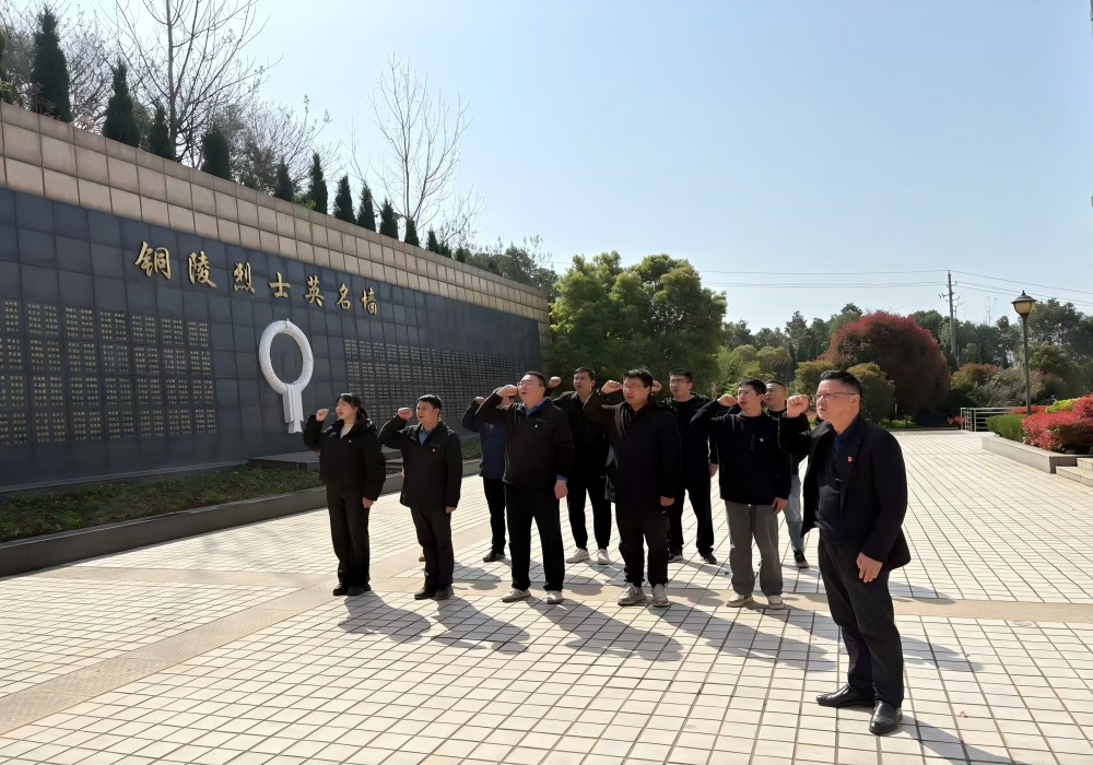 全體參與人員身著黑色上衣,列隊前往烈士紀念塔敬獻鮮花,集體默哀致敬。隨后,我們移步烈士陵園,在黨旗下重溫入黨誓詞,鏗鏘誓言回蕩于蒼松翠柏之間,彰顯新時代黨員的堅定信念。最后,在烈士紀念館中,我們跟隨講解員回顧銅陵地區革命斗爭歷史,通過珍貴文物和影像資料深切感悟先烈英勇無畏的奉獻精神。