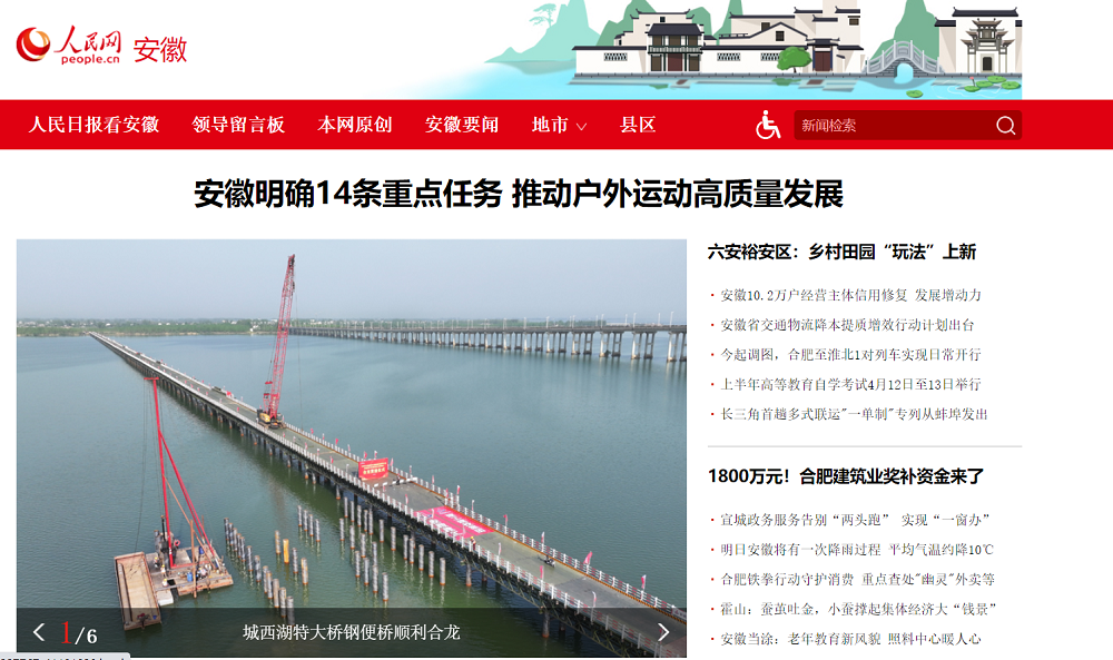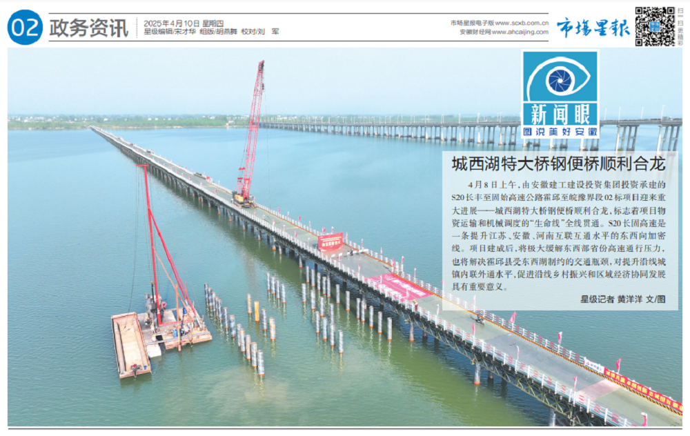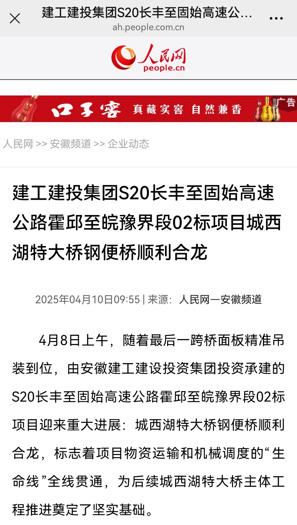 4月8日,建工建投S20長(zhǎng)豐至固始高速公路霍邱至皖豫界段工程路基路面02標(biāo)城西湖特大橋鋼便橋順利合龍貫通。人民網(wǎng)、《市場(chǎng)星報(bào)》深入項(xiàng)目一線展開(kāi)報(bào)道,稿件登上人民網(wǎng)安徽頻道首頁(yè)。