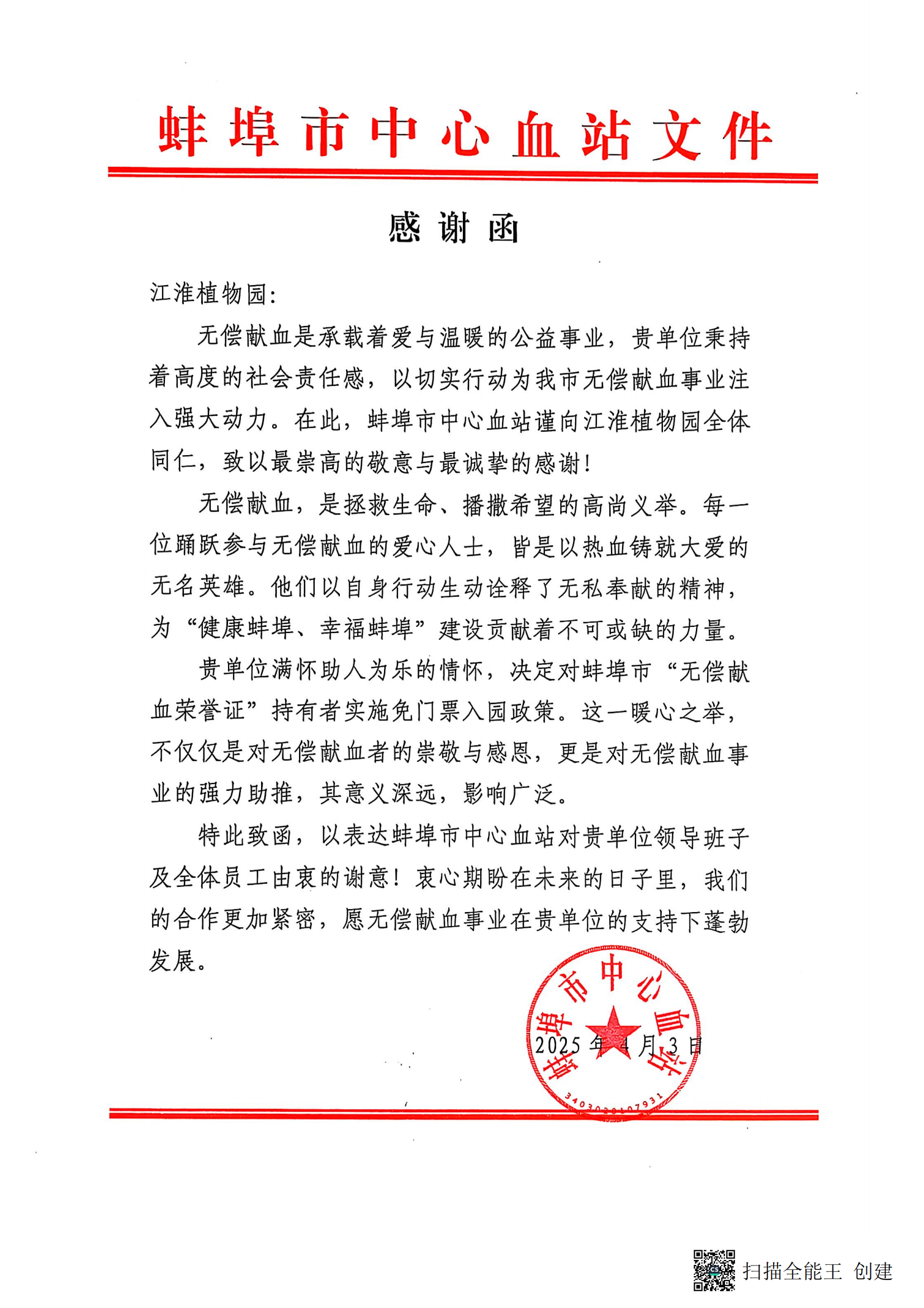 近日,建工水利所屬江淮植物園因積極履行社會責任獲蚌埠市中心血站與燕山鄉政府致信感謝。