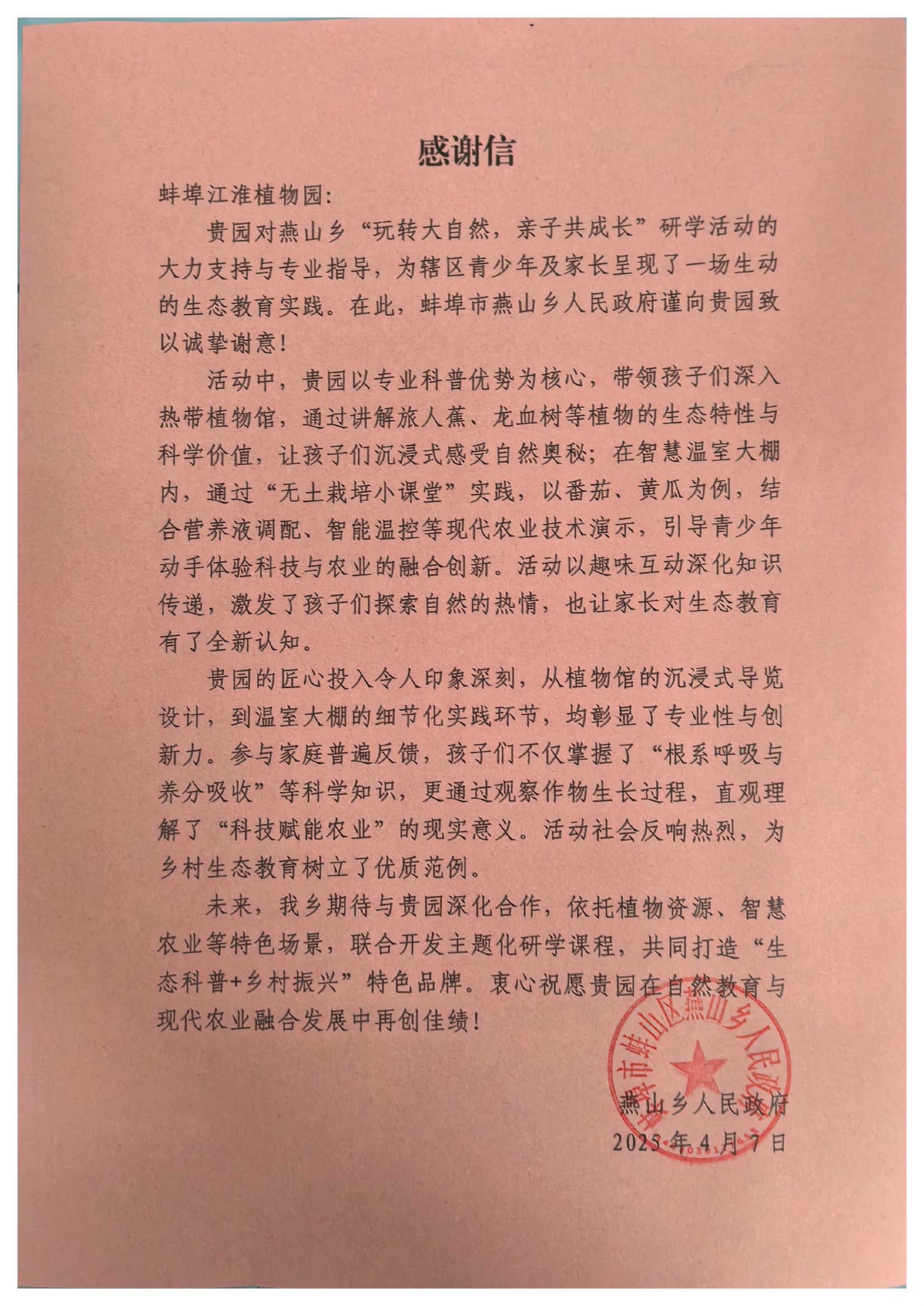燕山鄉政府對江淮植物園支持“玩轉大自然,親子共成長”研學活動表達謝忱。作為鄉域特色教育活動,江淮植物園憑借豐富植物資源和專業團隊,為親子家庭打造沉浸式自然課堂,設置植物科普、生態體驗等環節,讓大家在趣味中感受生態魅力。