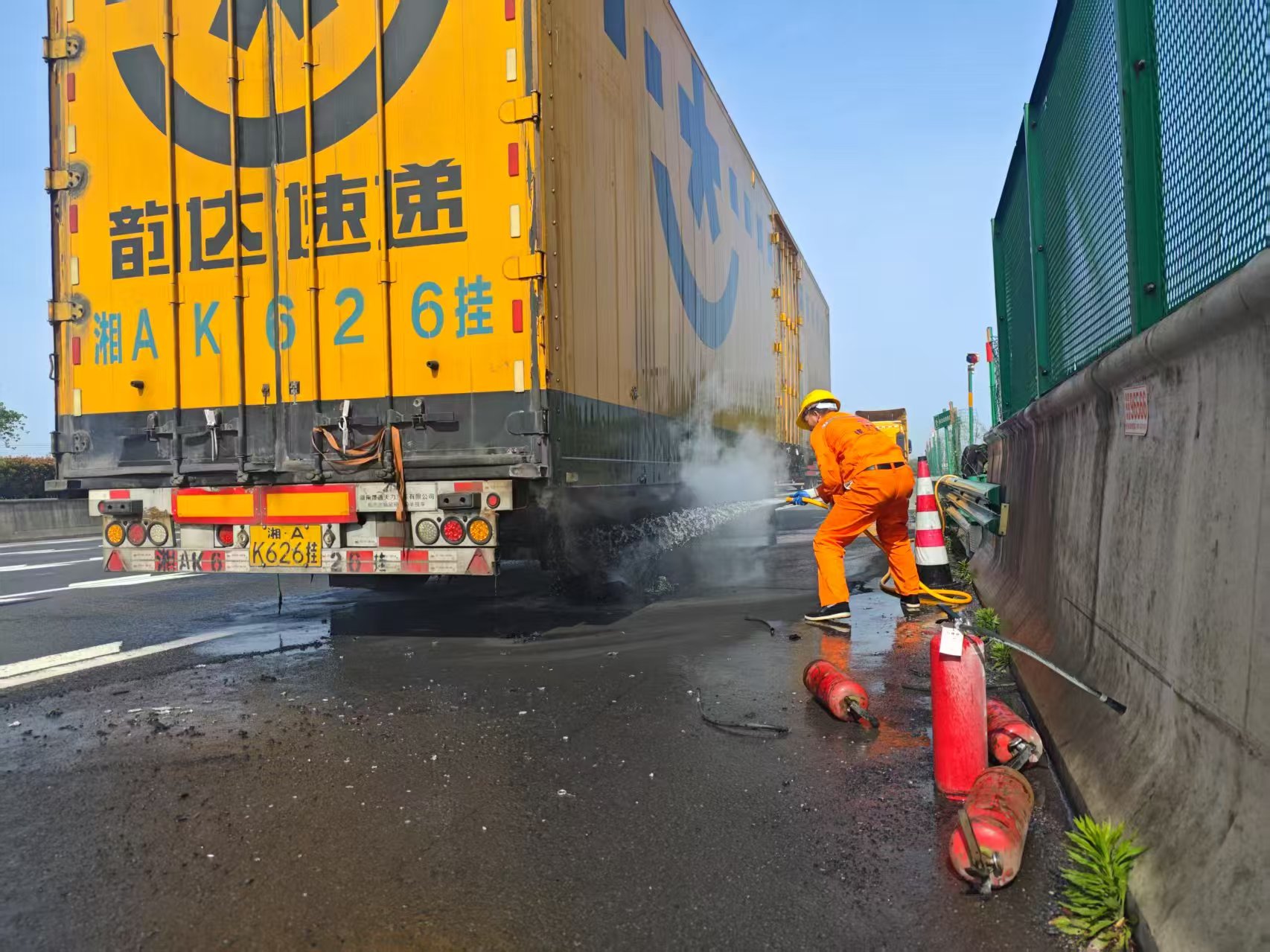 當天,施工現場的工作人員發現不遠處一輛物流車濃煙滾滾,火苗正從車廂處不斷竄出。項目負責人接報后,迅速組織現場施工人員攜帶滅火設備趕赴現場。同時,安排專人在后方設置警示標志,疏導交通,防止二次事故發生。