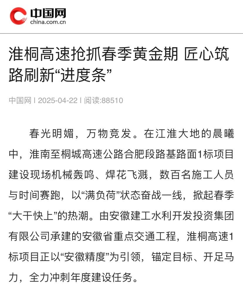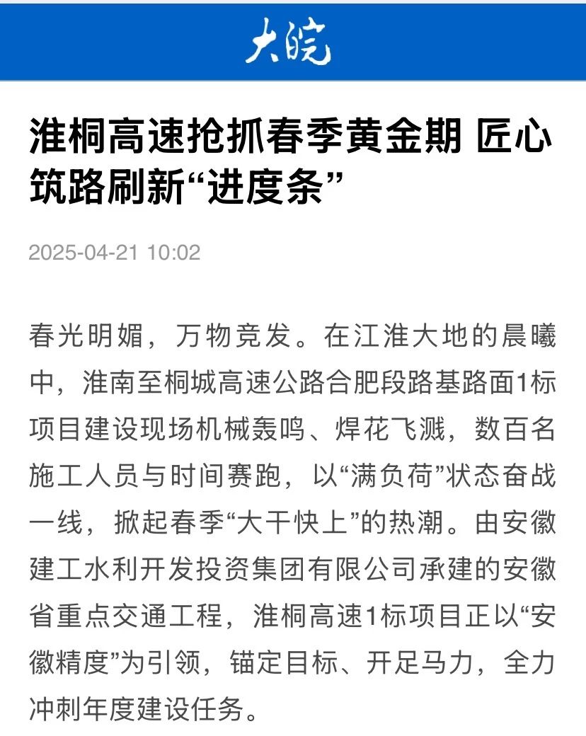 建工水利淮南至桐城高速公路合肥段路基路面1標項目建設現場機械轟鳴、焊花飛濺,數百名施工人員與時間賽跑,以“滿負荷”狀態奮戰一線,掀起春季“大干快上”的熱潮,全力沖刺年度建設任務,受到中國網、大皖新聞等主流媒體關注報道。
