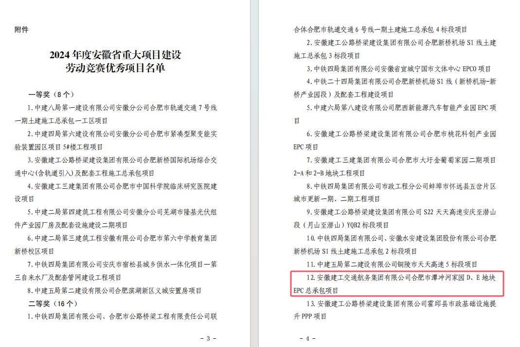 近日,安徽省住房和城鄉(xiāng)建設(shè)廳、安徽省總工會(huì)聯(lián)合發(fā)布《關(guān)于表?yè)P(yáng) 2024 年度安徽省重大項(xiàng)目建設(shè)勞動(dòng)競(jìng)賽優(yōu)秀項(xiàng)目的通報(bào)》,公司潭沖河家園 D、E 地塊 EPC 總承包項(xiàng)目和徐淮阜高速宿州段路基工程 02 標(biāo)項(xiàng)目表現(xiàn)突出,成功入選優(yōu)秀項(xiàng)目名單。