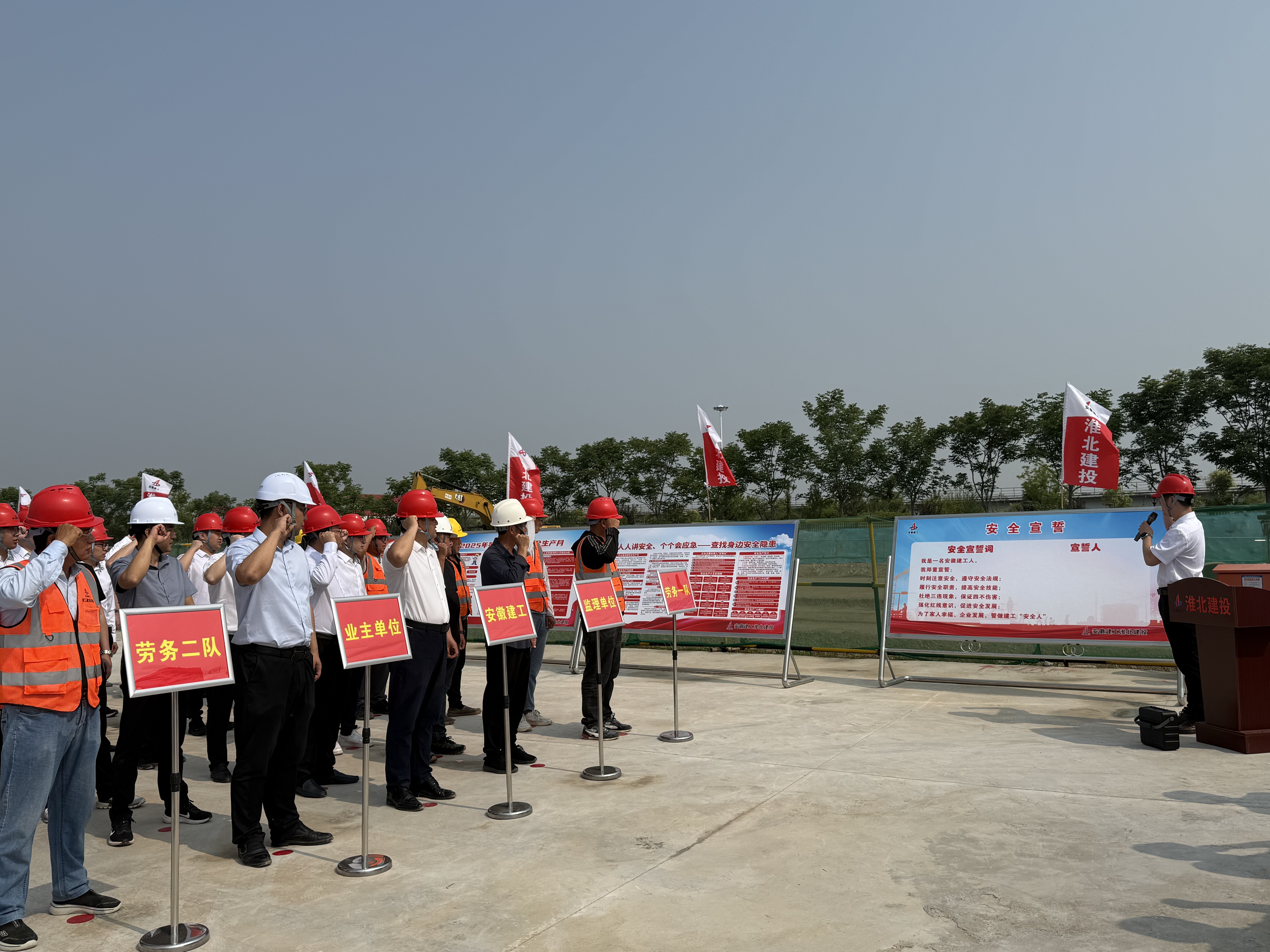 6月3日上午,安徽建工淮北建投2025年“安全生產月”活動啟動儀式暨現場觀摩會在淮北市烈山水廠項目現場舉行。安徽建工淮北建投黨委書記、董事長、總經理張玉明宣布活動正式啟動,并作動員部署講話,公司黨委委員、副總經理朱成亮帶領全體人員進行安全宣誓。公司領導班子、機關員工、業主和監理單位、勞務隊伍、項目經理等50余人參加儀式。